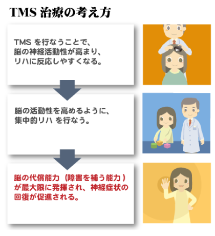 脳卒中治療ガイドラインにおいても「脳卒中後ADL改善のために、経頭蓋磁気刺激を行うことは妥当である(推奨度 B・エビデンスレベル中)」とされ、通常のリハビリテーションでは回復困難であった麻痺などの改善を目指すことができるとされています。