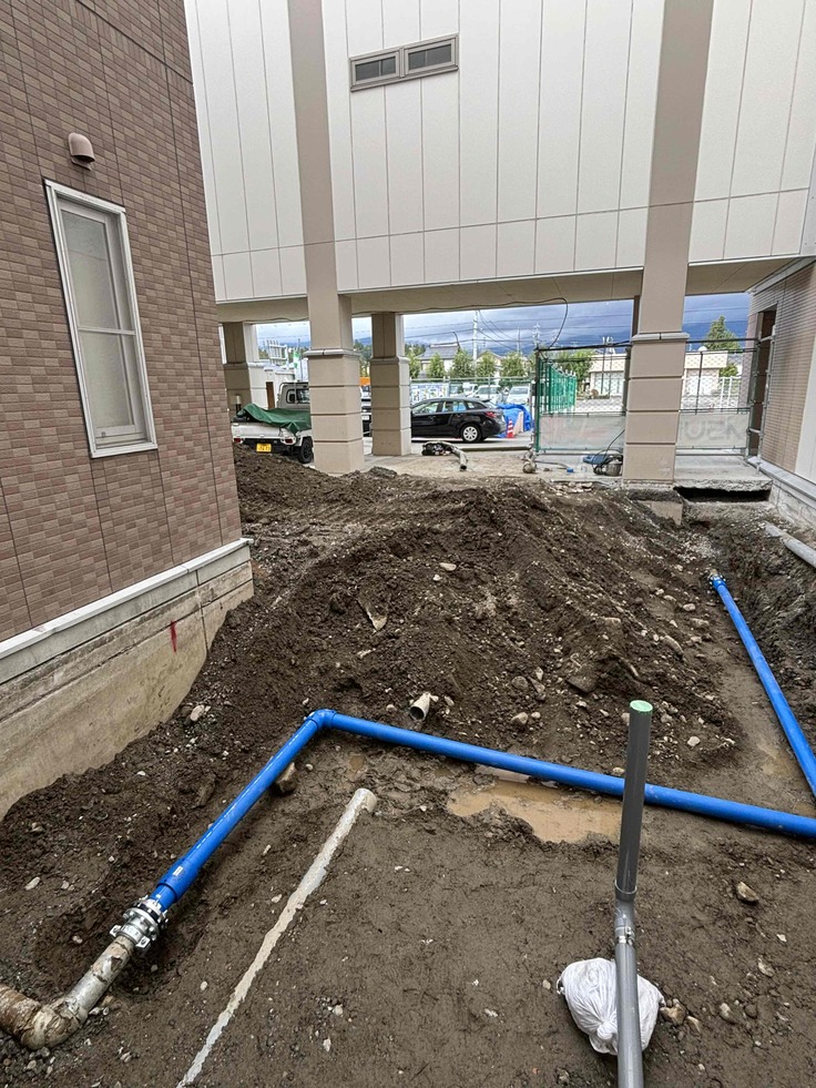 建物の中と外で配管工事が行われています🚧✨