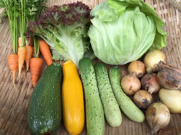 ※ 6〜7品目の野菜をお届けする予定ですが、種類は季節によって変わります。写真は6月の野菜セットの例です。