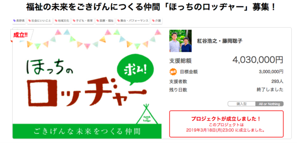 私たちのプロジェクトは、3/18、23時を持って、293名のほっちのロッヂャー宣言(支援)にてプロジェクトが成立しました!