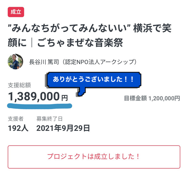 そして、192人の方から【1,389,000円】のご支援を頂きました😿