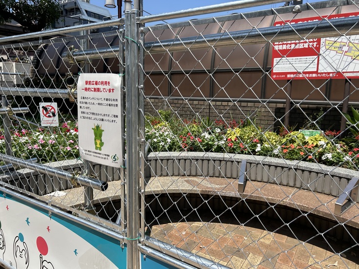 この暑さの中でかつこの写真のようにベンチにフェンスが張られてしまっているので、居場所が限られてしまっています。