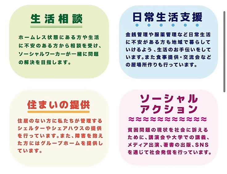 埼玉県さいたま市を中心に生活困窮状態にある方の支援を行っているNPO法人です。路上巡回活動やシェルター、グループホームを通じた住まいの支援、支援活動の社会への発信(ソーシャルアクション)を行っています。