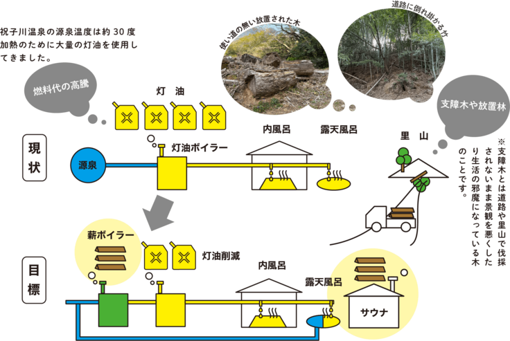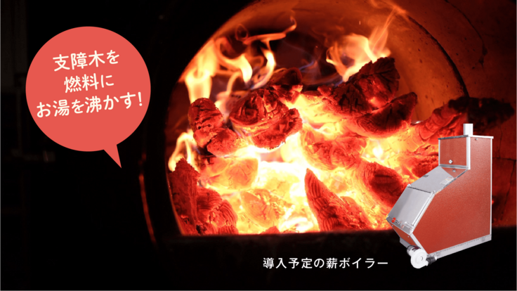 温泉全ての熱源を薪ボイラーで賄うにためには大規模な設備投資が必要です。今回は現状の灯油ボイラーの稼働を抑えるために補助的に活用する比較的小規模の薪ボイラーを導入します。実績を詰み、薪調達の仕組みを整え、効果を検証して次のステージを目指すステップとします。