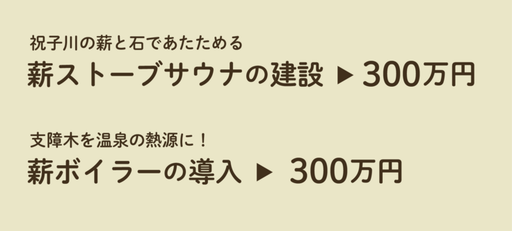 オノコボデザイン合同会社が祝子川温泉に薪サウナと薪ボイラーを導入する費用として充当します。