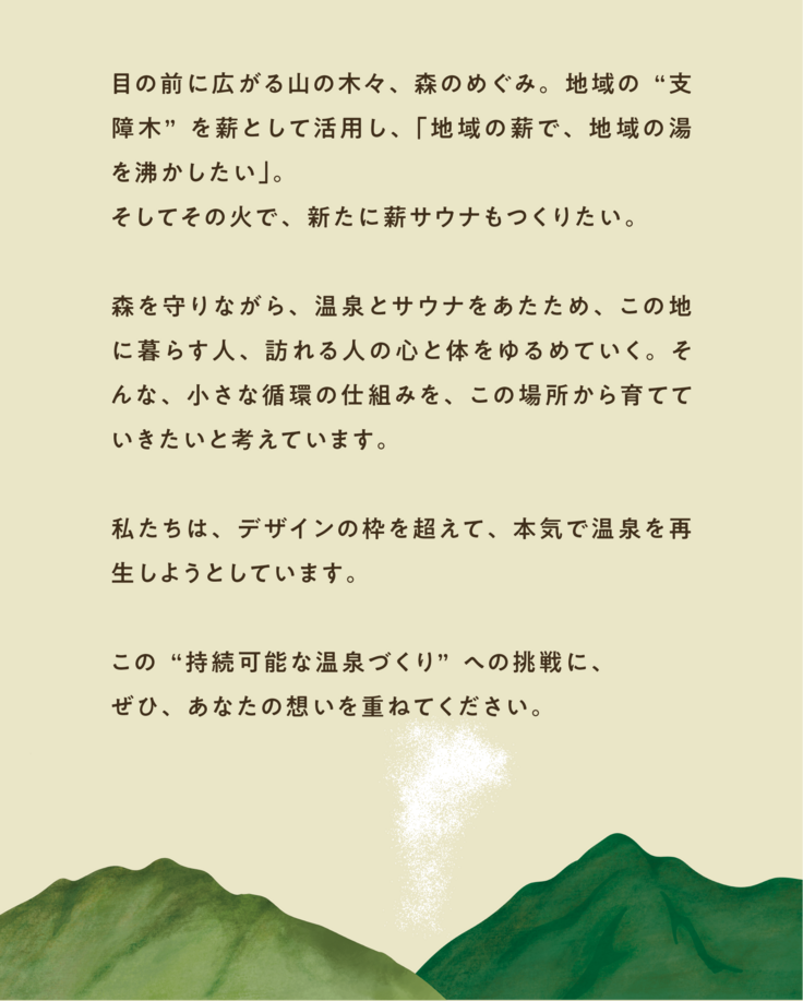 ※なお、ととのいスペースのウッドデッキと水風呂、水風呂に使う冷水(湧水を活用)供給設備の建設費、サイン・看板等のリニューアル、ホームページ制作、送迎車の導入などにかかる費用(約600万円)は、私たちが銀行融資を受けて、必ず整備を実施します。「自分たちもリスクを背負いながら、本気でこのプロジェクトを成功させたい」 という想いを、ぜひ受け取っていただけたら嬉しいです。
