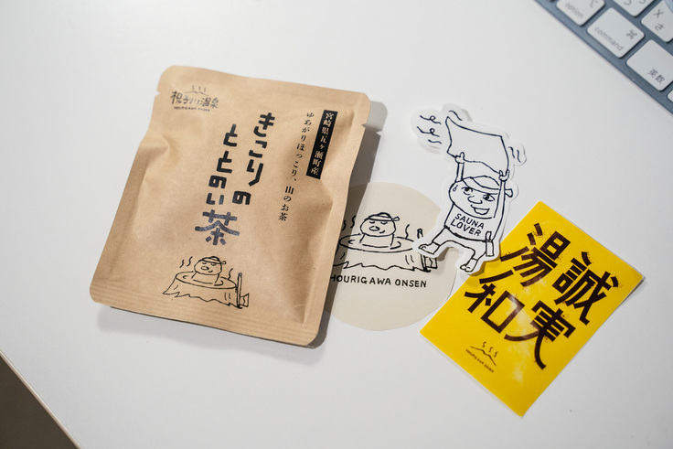 写真にもある「きこりのととのい茶」や、祝子川温泉オリジナルステッカーを製作中!