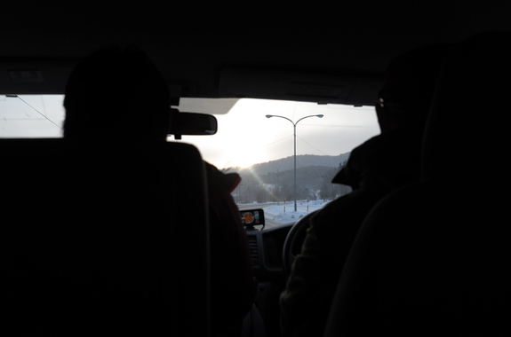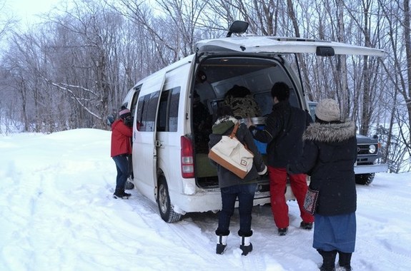 朝5時の北海道旭川。今回一番の目玉イベント。生まれて初めて経験する氷上ワカサギ釣り体験をしに、南富良野のかなやま湖という湖に、ELEMENT今井社長の大型車で連れていって頂きました。今回のキャラバン最大定員9名+現地で関わって下さる那須造園のスタッフさん。