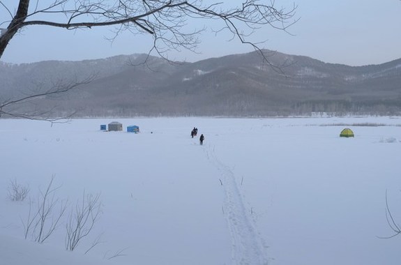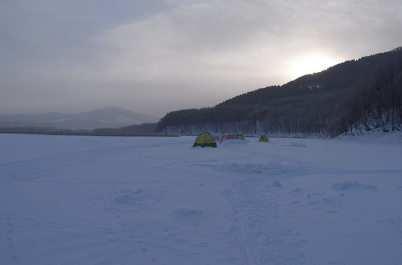 50cm~70cmくらいだろうか、湖の上には分厚い氷の膜が出来ていました。(話を聞くと、5cm氷の厚みが出来るだけで、その上を車が走れるようになるそうです。)