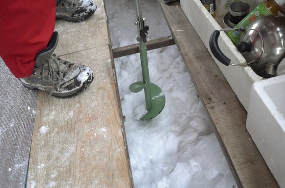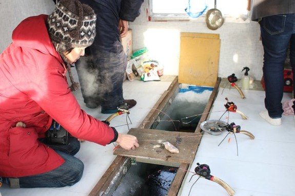 今回ワカサギ釣りを体験させて頂く漁場は、断熱材の入った小屋の中。小屋の中ではストーブが焚かれ、断熱材が床面にも敷かれていました。