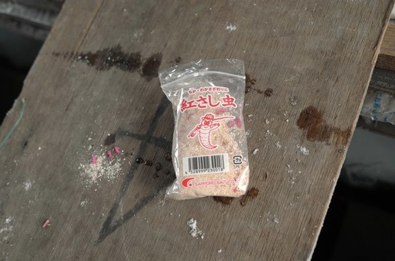 餌は、紅さし虫という "ウジ虫" の一種。これをサビキ(3つから5つ針がついた仕掛け)につけ水面に落とす。ワカサギは連なって生息しているそうで、那須造園の方に、魚がいる棚に、落とす仕掛けの水深を合わせて頂いた。