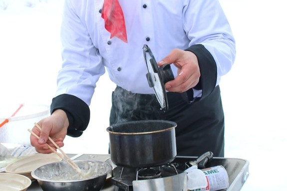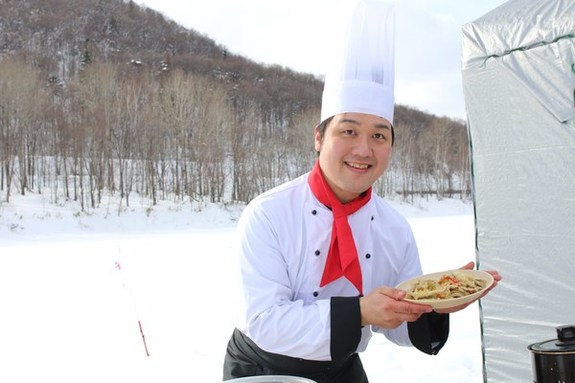 先ほど少しふれた、料理研究家でクッキングエンターテイナーの大西さんが、氷上にキッチンをスタンバイさせ、料理をふるまってくれた。