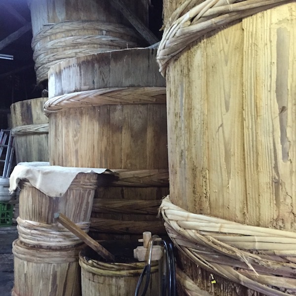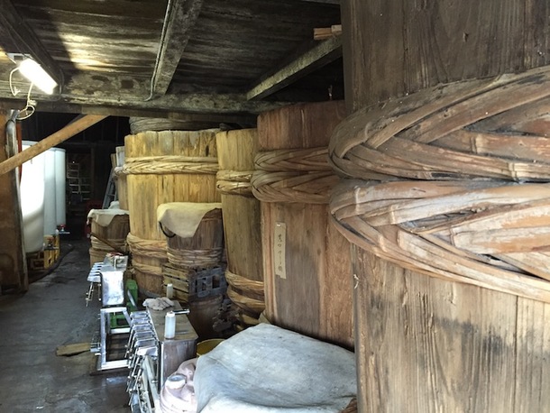 人の背丈をゆうに超える、大きな木桶がずらりと並んでいます。今では、ほとんどの醤油はステンレス製の近代的な施設で作られていて、この木桶を作る職人さんもほとんど引退され、お醤油もさることながら昔ながらの醤油蔵じたいがもはや文化財級です。