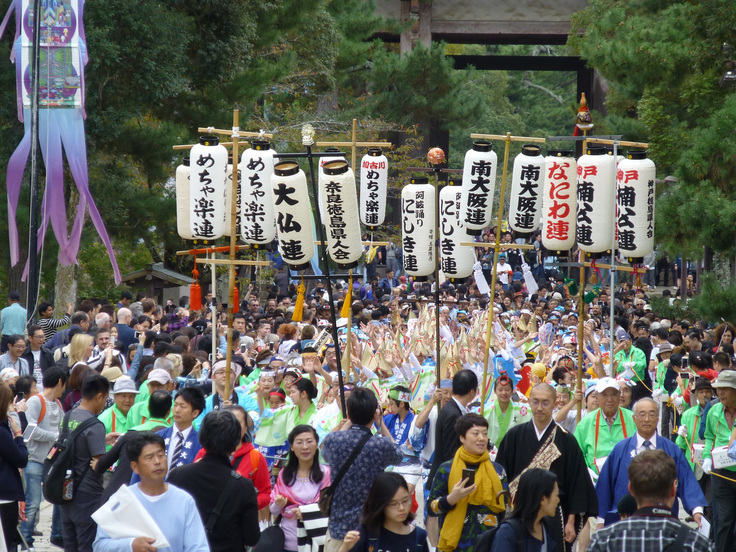 そして実現したのが「紀伊半島豪雨災害 復興祈願 奉納阿波おどり」です。関西の阿波おどり仲間も、私たちの申し出に賛同してくれました。南大門から中門に向かって250人もの阿波おどり愛好家がパレード、世界中からの参拝者に「復興支援」を訴えました。