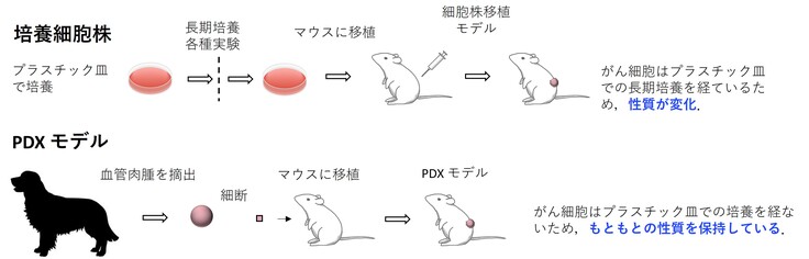 人で使われている薬や犬の他のがんで使われている薬の効果を PDX モデルを用いて評価し、血管肉腫の患者犬でも効果が期待される薬剤・化合物を選出することができるようになります。
