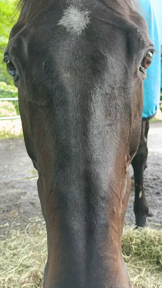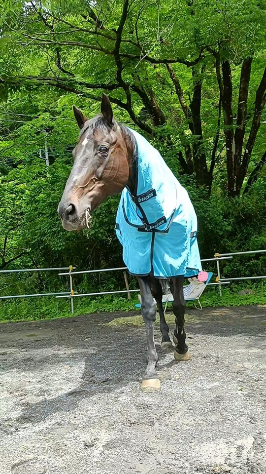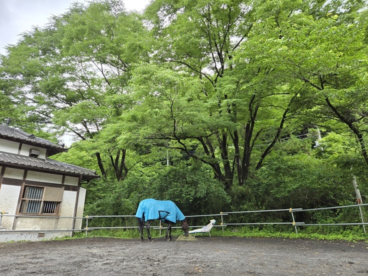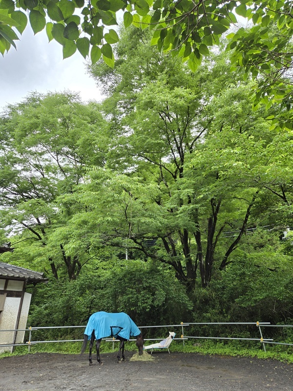 厩舎横にあるいつもの放牧場にはアオちゃんが居ました。