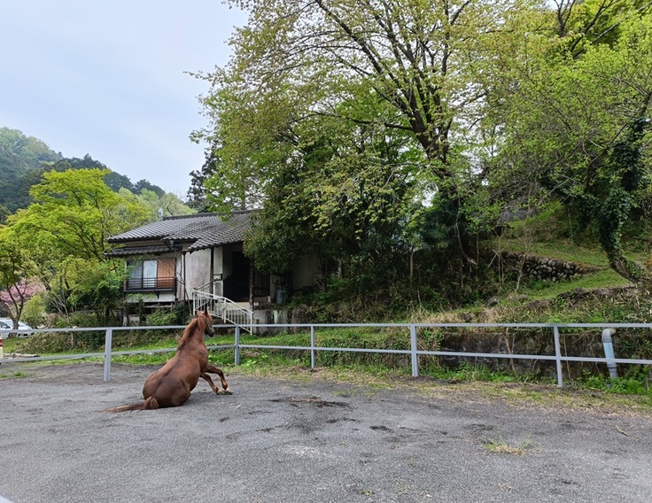 厩舎がまったく見えなくなるので、1頭だけを連れてくると仲間が見えず