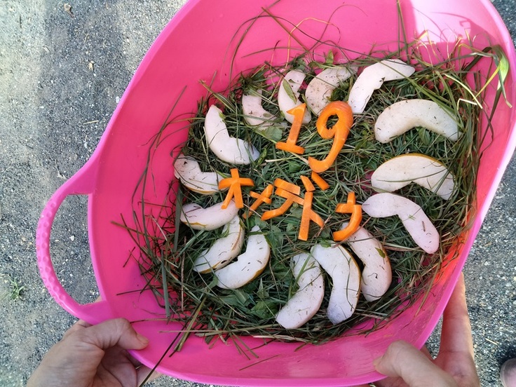 プレゼントにいただいた梨とリンゴとニンジンで恒例のバースデーケーキを作って