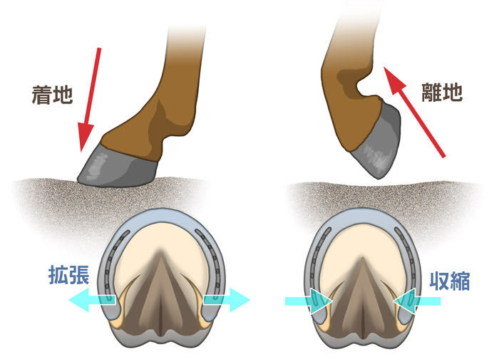 馬の蹄は着地している際は蹄の後方部分が横にわずかに広がり、地面から離れた際に広がった部分が縮みます。 この働きによって人のふくらはぎと似たようなポンプ的役割を果たし血液循環の補助をしているのです。