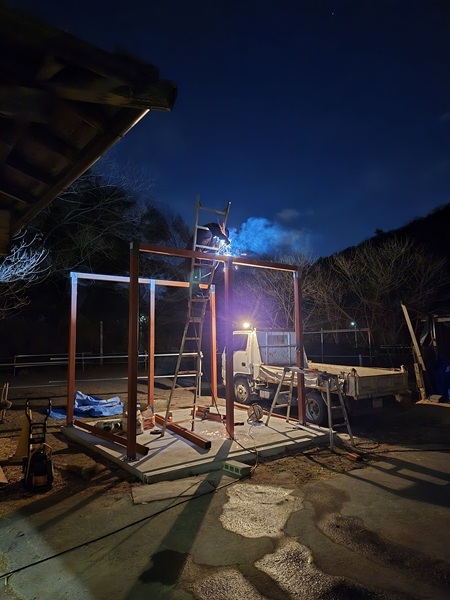 (鉄柱の上を溶接しているところです)