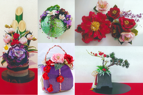 私が制作する造花は新たな日本の花文化として生み出した造花です。異素材の組み合わせのちりめんなどの布素材や土佐和紙などの紙素材、レザーなど異素材を組み合わせることで、どこにもない日本独自の造花を作っています。