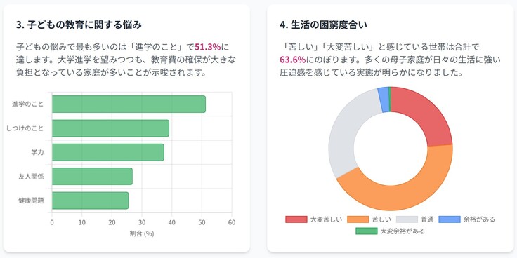 子どもの教育では進学について51.3%の方が悩んでおり、生活が「苦しい」「大変苦しい」と感じている世帯は合計で63.6%に上っています。