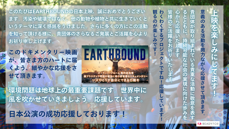 このたびはEARTHBOUNDの日本上映、誠におめでとうございます。汚染や破壊ではなく、他の動物や植物と共に生きていくというテーマに深く感銘をうけました。さらに多くの方にこの活動を知って頂ける様に、貴団体のさらなるご発展とご活躍を心よりお祈り申し上げます。