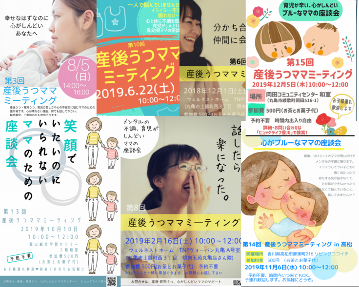 2018年設立 ・2018年~2020年2月まで 「産後うつママミーティング」を 香川県丸亀市で隔月、高松市で年3回開催 ・2018年 多度津町で産後うつ啓発イベント開催 ・2019年度 かがわ健やかこども基金助成事業 ・2019年度 丸亀市市民活動ステップアップ助成事業として 子育て支援パンフレット作成 ・2020年8月からメンタルヘルスに関する個別相談事業開始