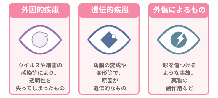 病気やけがにより角膜が濁ってしまい、角膜本来の透明性を失ってしまうと、眼の中に光を取り入れることができなくなってしまいます。このような場合に角膜移植が必要となります。