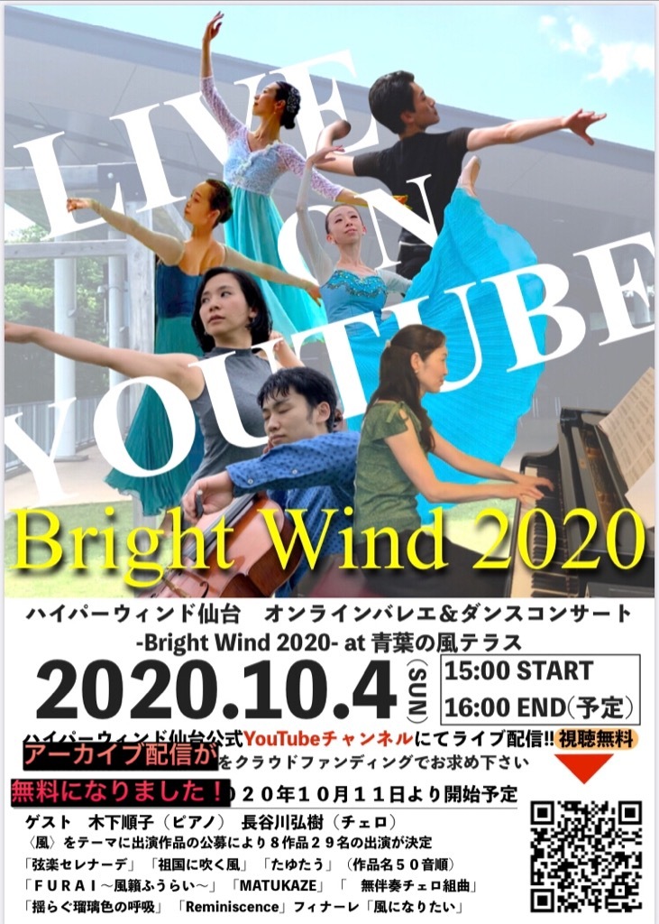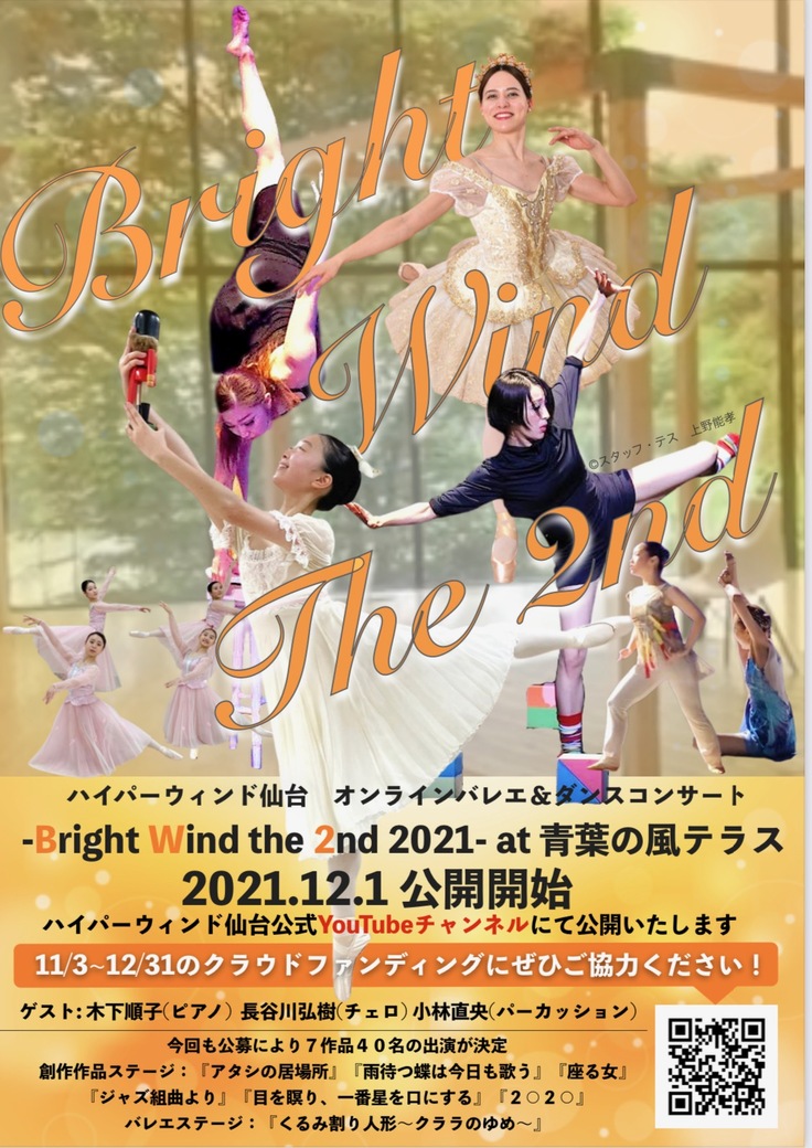 2020年、新型コロナウィルスの感染拡大により、多くの舞台芸術の公演が中止を余儀なくされる中でも、「仙台のバレエ&ダンスシーンを盛り上げたい!」という強い想いから、インターネットを使っての配信コンサート《オンラインバレエ&ダンスコンサートーBright Wind 2020ーat青葉の風テラス》《オンラインバレエ&ダンスコンサートーBright Wind the 2nd 2021ー》を企画・実施しました。