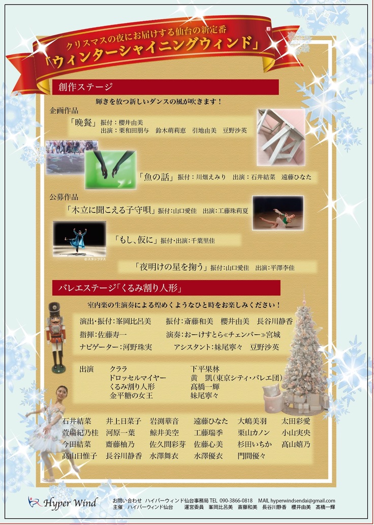 今回のWinter Shining Windは2部構成になっており、第一部は「創作ステージ」と題して、モダンバレエ・コンテンポラリーダンス・即興ダンスなどの作品を上演します。第二部は「バレエステージ」と題して、『くるみ割り人形』のダイジェスト版をおーけすとら《チェンバー》宮城様の生演奏と合わせて上演します。