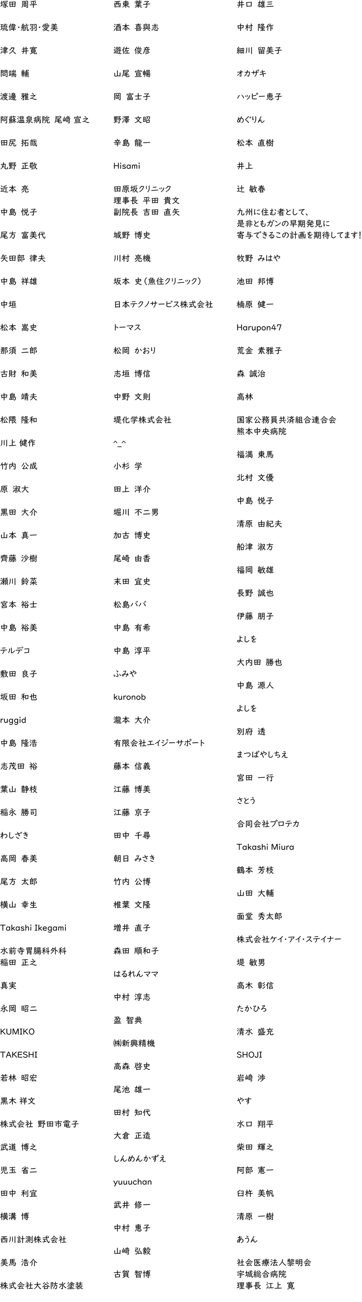 ご支援いただいた方のうち、HPへの掲載をご承諾いただいた皆さまのお名前(敬称略・順不同)を掲載させていただきます。