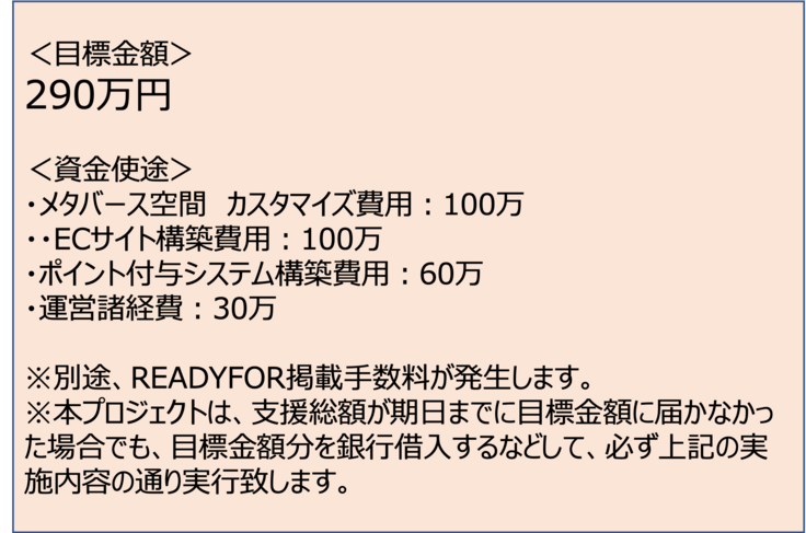 <資金使用用途内訳> 授業内で利用する ①メタバースカスタマイズ費用:100万 ②ECサイト構築費用:100万 ③ポイント付与システム構築費用:60万 ④運営諸経費:30万