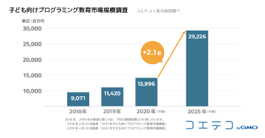 プログラミング必修化の影響もあり、2020年から2025年の5年間で約2倍の300億円規模まで市場が成長すると予想されており、教育産業で成長著しい分野です。受験対策等の旧来型の教育産業に取って代わる可能性を秘めた、新しい教育分野として注目を集めており、市場としての魅力が高まっています。