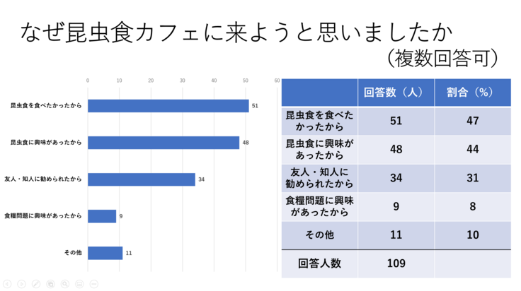 私達の目標は昆虫食の魅力や知識を発信するだけでなく、食糧問題にも興味を持ってもらうことを目的に活動してきました。そこで、昆虫食カフェにご来店いただきましたお客様に昆虫食や食糧問題についてのアンケートを取り、調査を行いました。