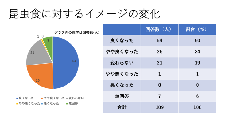 アンケートの結果から、ご来店いただいた多くのお客様に、昆虫食に対するイメージがよくなったと感じていただけ、また食糧問題についても考えていただくことができました。伊吹ゼミ13期生一同、よい結果を出すことができたと思っています。