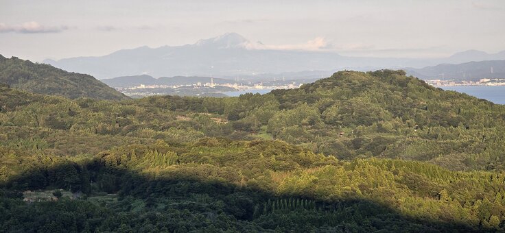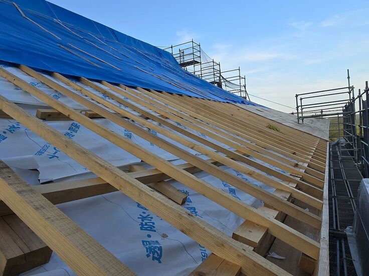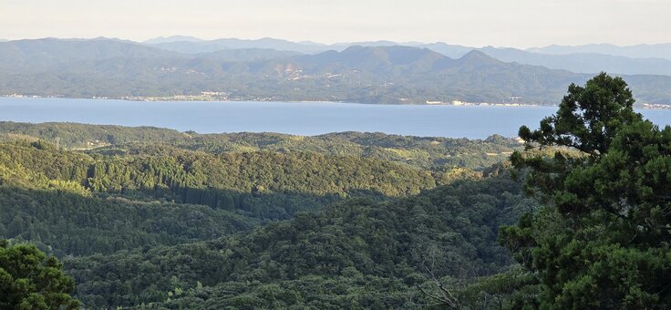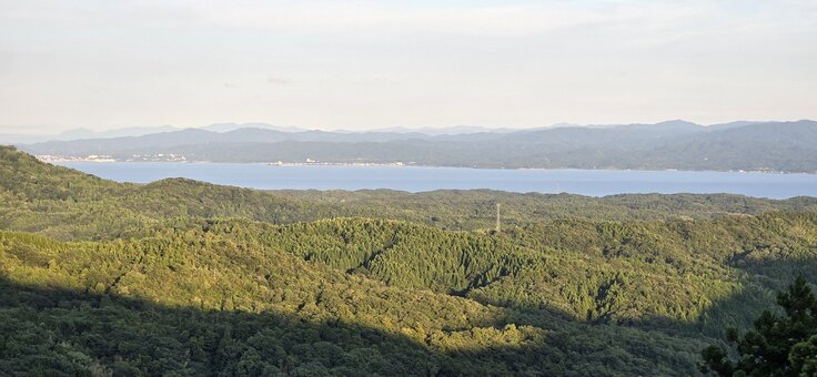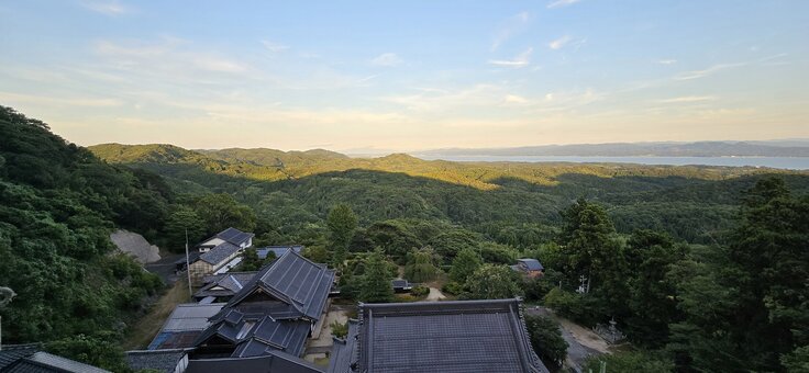 ご支援いただき有難うございます。大工さん方が帰った後、足場の上に登ってみました。日没30分前の18時半ごろです。しょっちゅう上がんるんですが…。足場の上は標高は210メートくらい、島根半島中央部から東方を見ると、宍道湖の左端は松江の街、その向こうに大山です。鬼瓦の位置からの眺望はまさに天空だなと思いました。屋根の野地板は着々と進み、9月に入れば愈々チタン貼りの工事に入ります。引き続きよろしくお願い申し上げます。