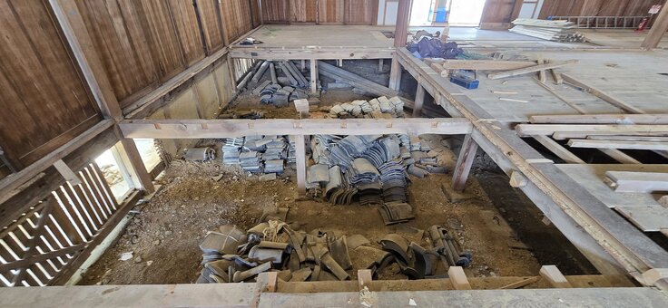 第1期「チタン屋根工事」により、 おかげさまで立派な屋根が完成し、ついに雨漏り が止まりました。現在、お堂の内部はがらんどうの状態です。