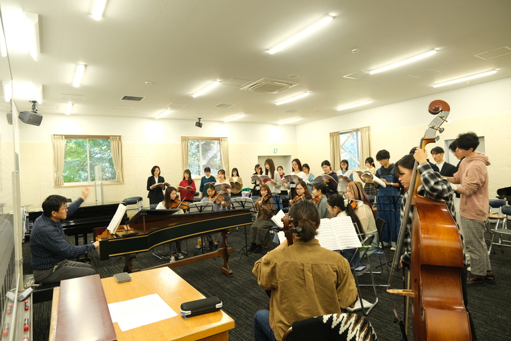 練習は音楽メジャーの佐藤先生にご指導いただいたり、学生たちで話し合って試行錯誤しながら進めています。