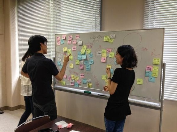 続いて、ワークショップの方法を体験。本番とは異なるトピックで①付箋を用いて一人でブレインストーミング(アイディア出し)、②お互いの意見を発表し合う、③近いアイディアは付箋を移動することでグルーピング といったプロセスを踏みます。これにより、自分とは違う思考を持つ他人と協働する際には「アイディアの可視化」が非常に役立つと身を持って学び、みんなでこの方法に太鼓判を押しました。
