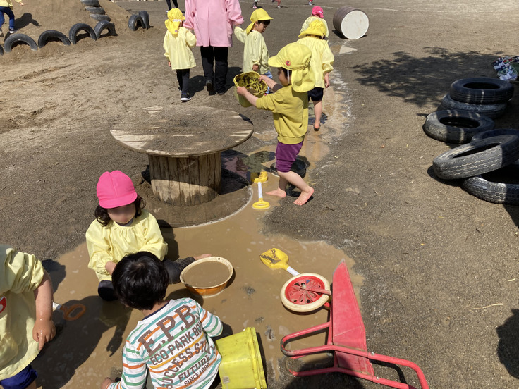雨の後、水たまりが1番の遊び場です。泥をこねたり、素足で感触を楽しんだり、飛び跳ねて水を飛ばしたりと様々なことをしています。