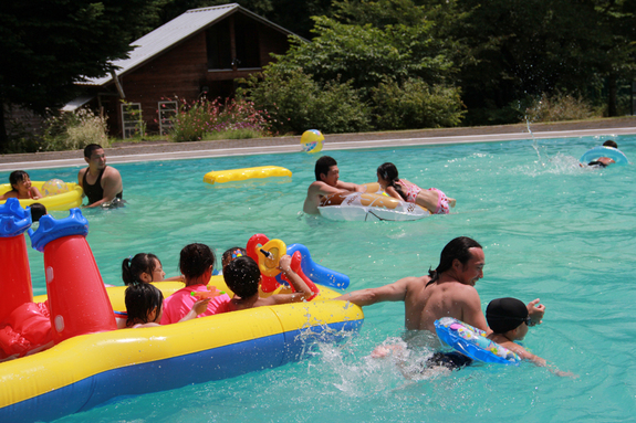 34名のキッズ達が集まり、水遊びを楽しみにしています。