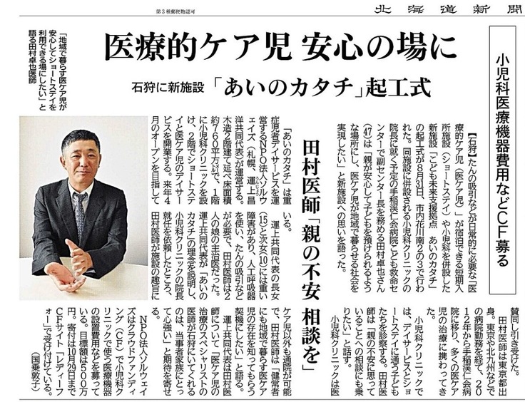 北海道新聞(2024.9.3)に掲載 <小児科クリニックの院長に就く予定の田村医師インタビュー>