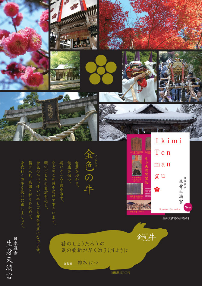 ▷「金色の牛」には、お祓いをお仕えし、拝送致します。御守りと同じく、お願いごとを書き込み、身近において下さっても大丈夫です。