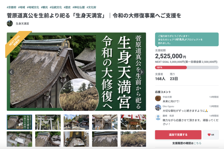 生身天満宮のクラウドファンディングを応援くださり、誠にありがとうございます。