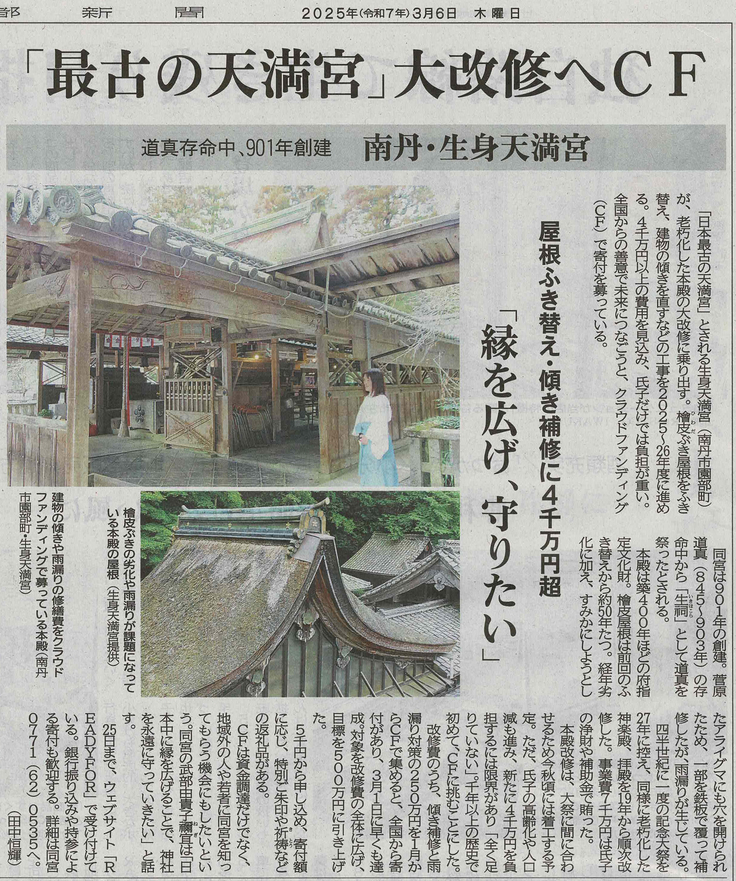 生身天満宮 令和の大修復事業クラウドファンディングを応援くださり、誠にありがとうございます。
