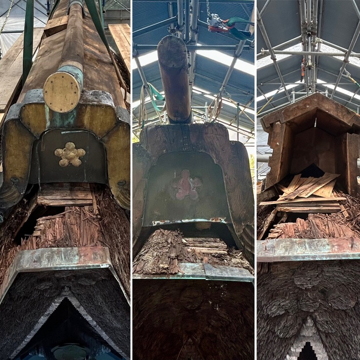 箱棟や鬼の銅板などが取り解かれ、修復へ。