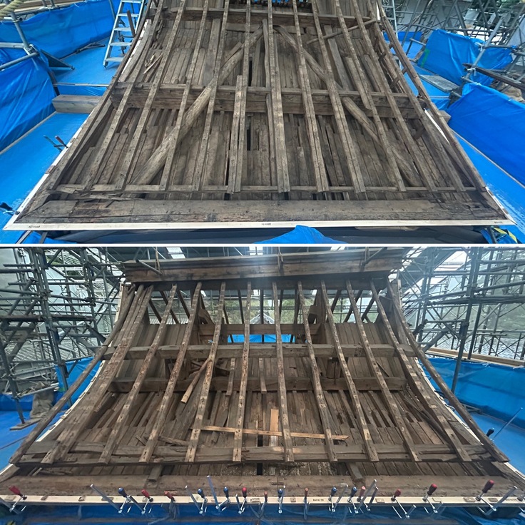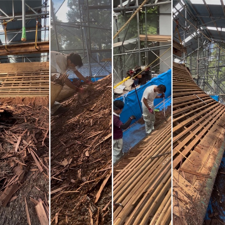 職人さんにより、屋根の下地、垂木や野地板、桟木、檜皮などが、丁寧に取り解かれました。