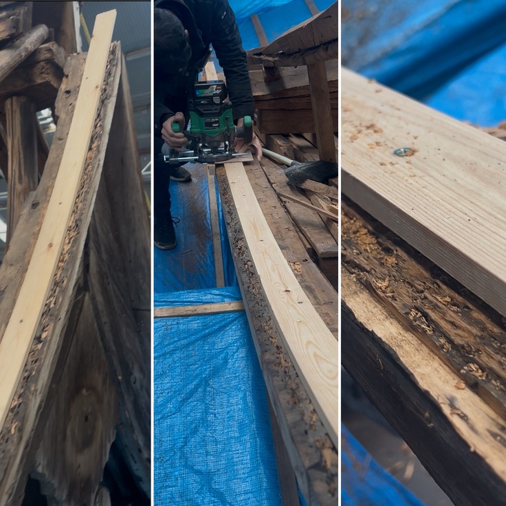削られた部分をなだらかに整えた後、修復のための新しい木材が取り付けられます。