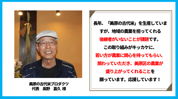 100,000円プラン(企業名・ロゴの掲載と高校生・参加者へご紹介&古代米1kg&白米30kg&農芸鴨1羽分をお届け)